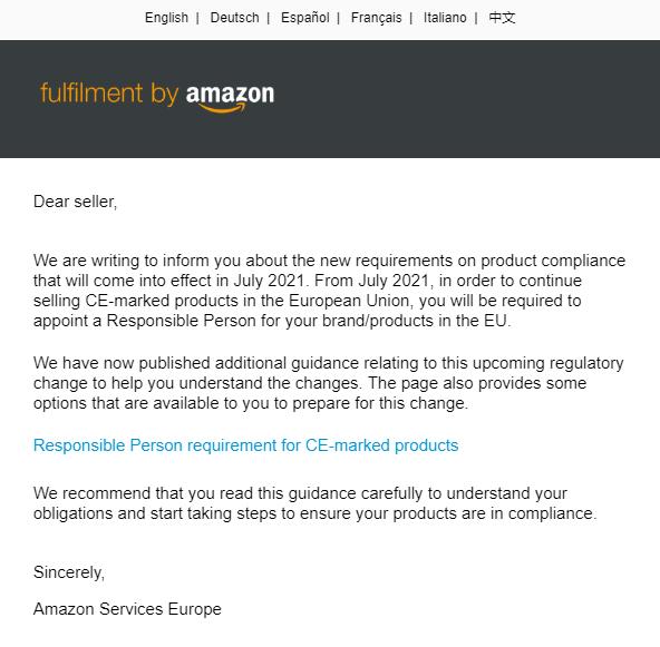 該新法規(guī)明確要求了歐盟境內(nèi)CE標(biāo)識商品的要求,目前有不少歐洲站的賣家都收到了亞馬遜的通知,主要內(nèi)容為:
